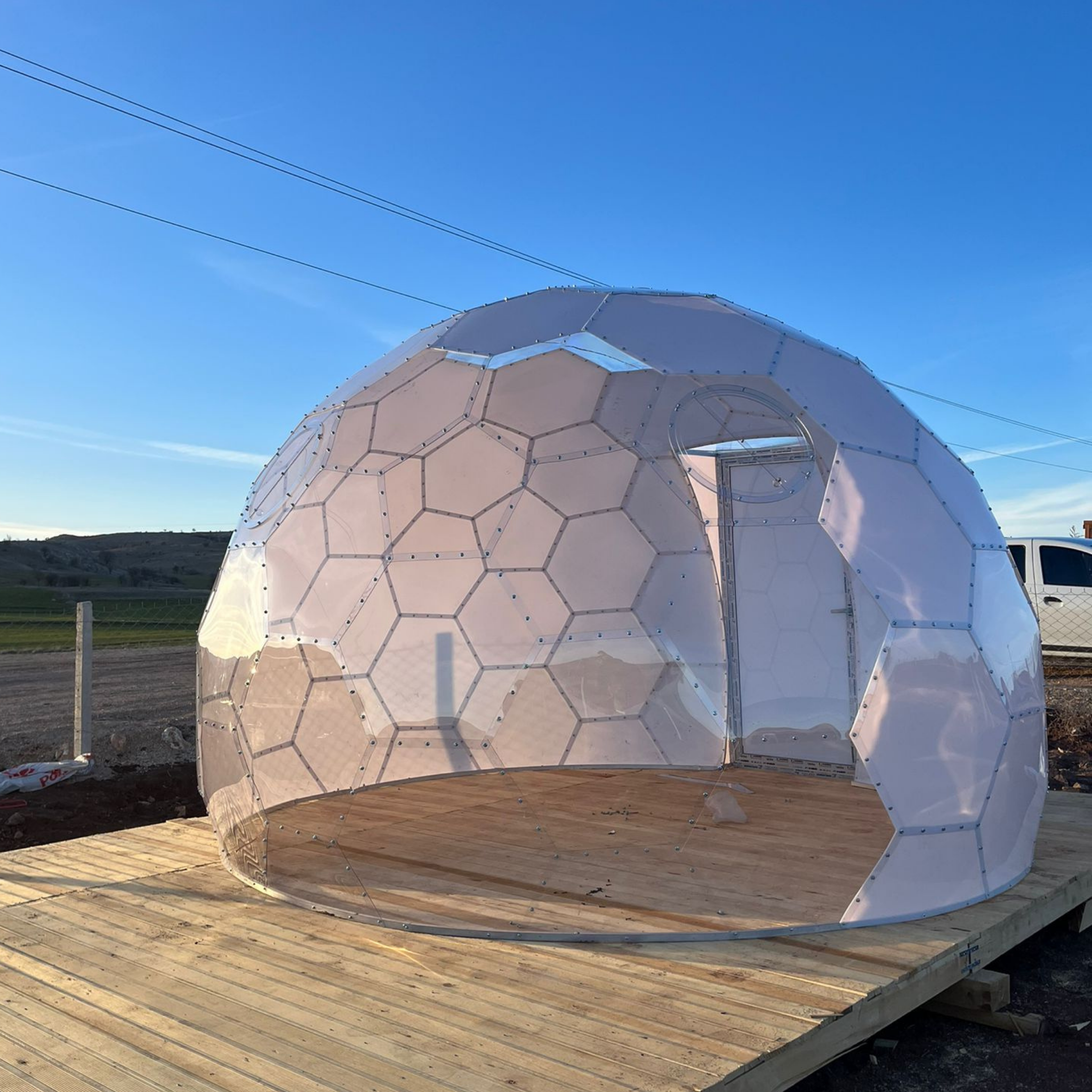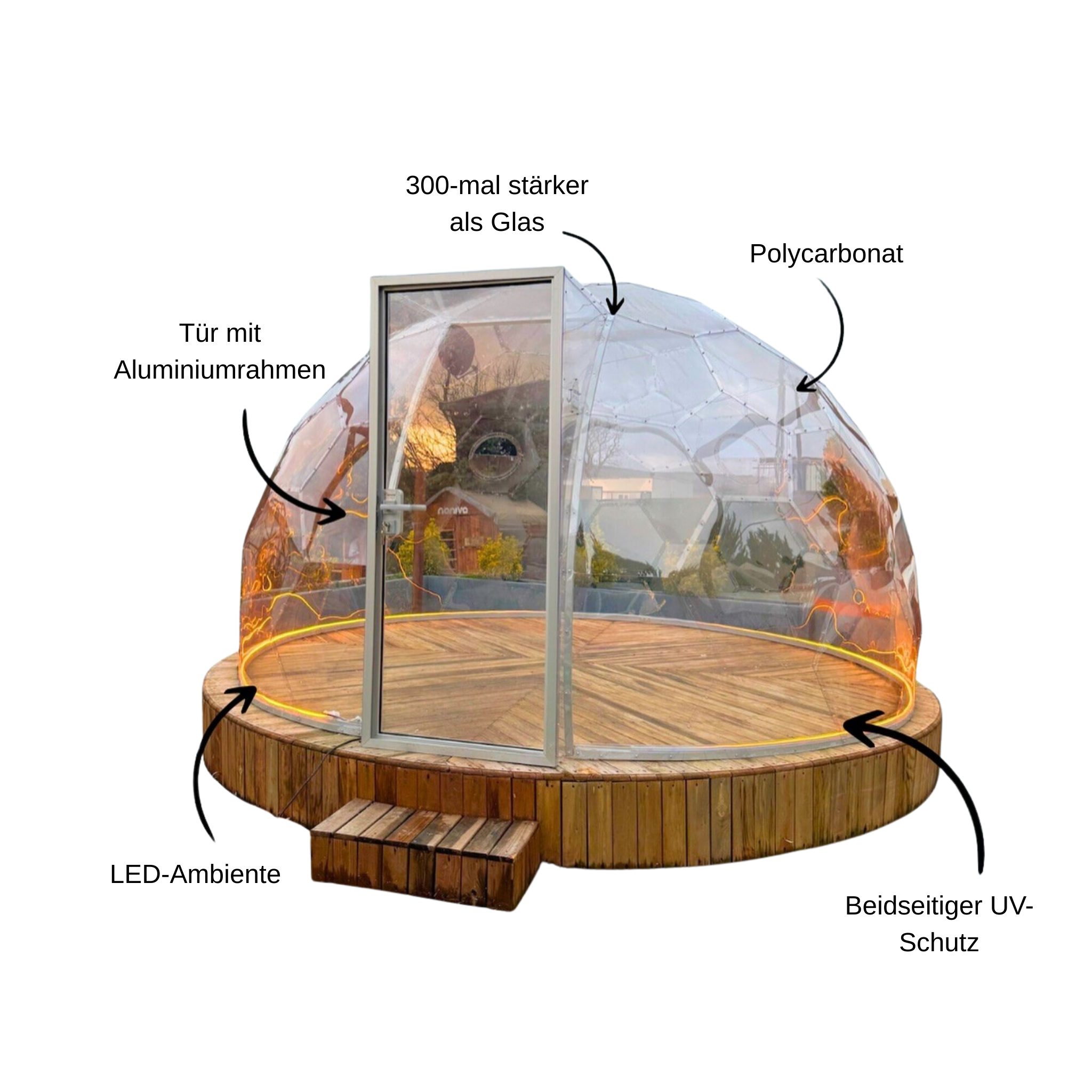 Die Gowoll Garten Kuppel wird aus hochwertigem, kristallklarem Solid-Polycarbonat gefertigt und ist für den ganzjährigen Einsatz im Außenbereich konzipiert. Die vollständig transparente Konstruktion bietet eine beeindruckende 360°-Rundumsicht und verbindet Naturerlebnis mit maximalem Schutz vor Witterungseinflüssen.