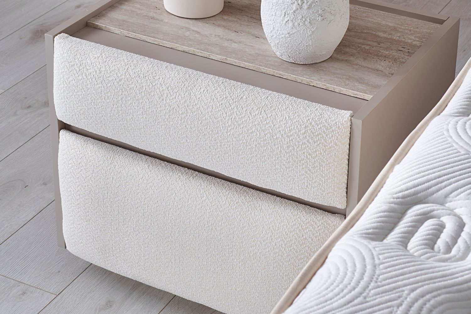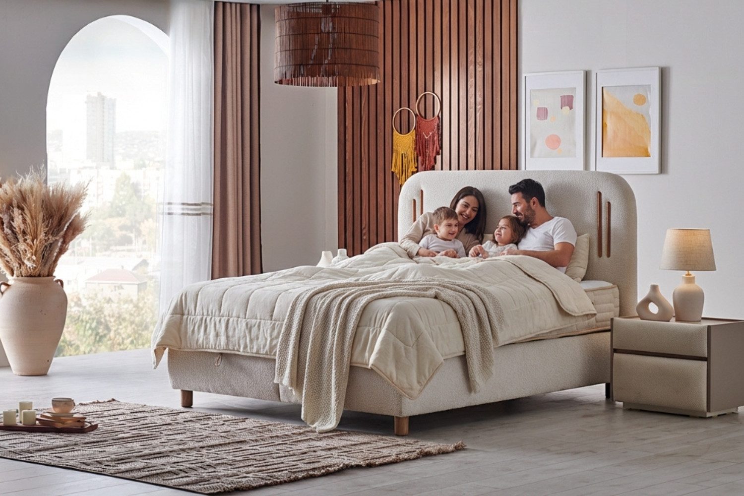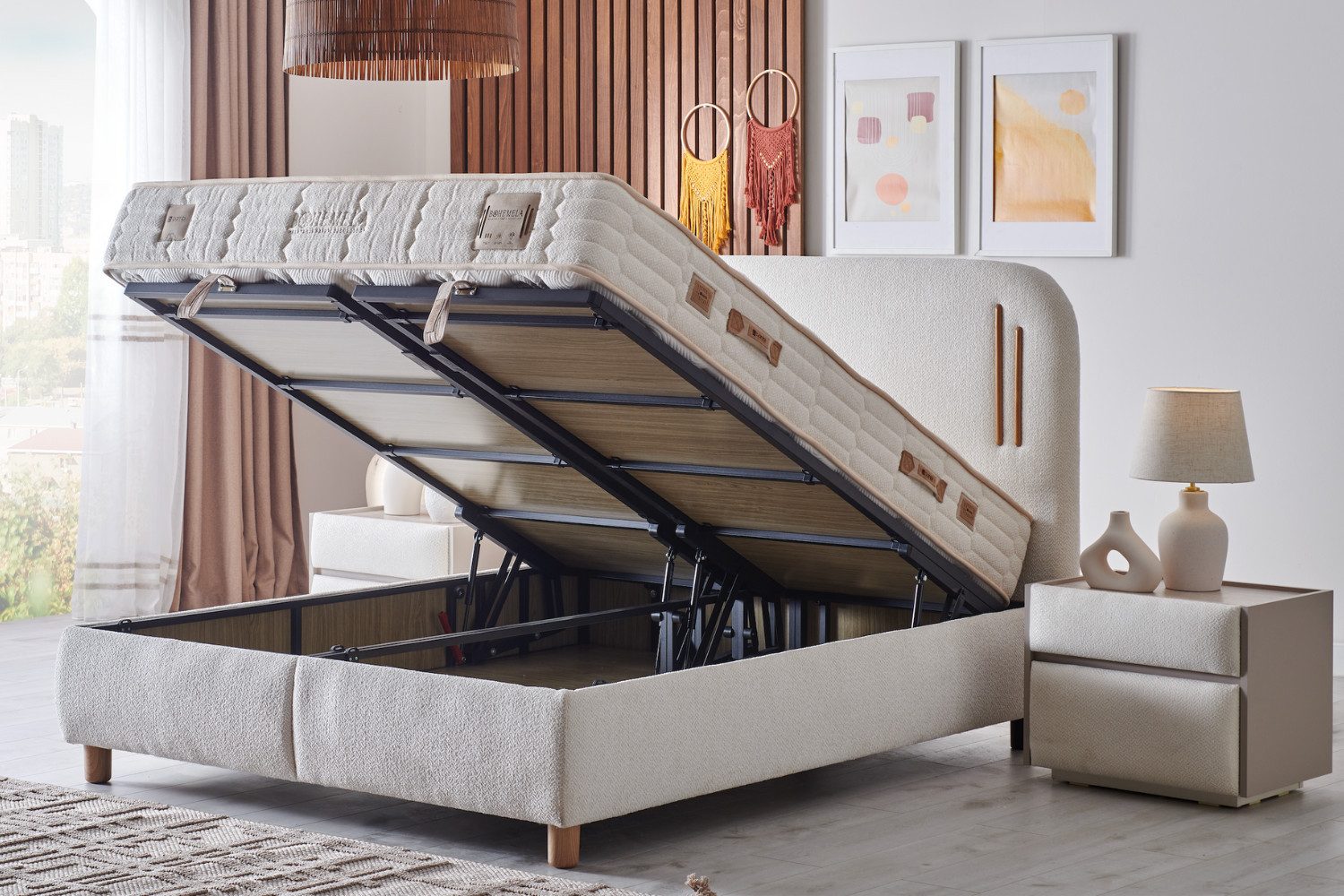 Das Bambi Bohemela Boxspringbett-Set vereint stilvolle Schlafzimmerästhetik, durchdachten Stauraum und modernen Schlafkomfort in einem hochwertigen Gesamtpaket. Der weich gepolsterte Look, das großzügige Kopfteil und die elegante, helle Oberfläche verleihen dem Bett eine ruhige, wohnliche Ausstrahlung – ideal für moderne, warme und harmonische Schlafzimmer.